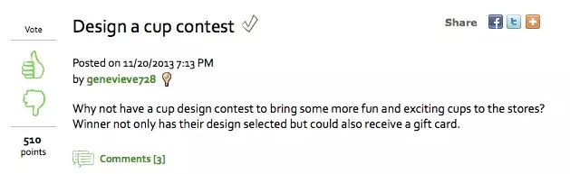 最妙的是,这整个事件的起始点,是从星巴克专门用来搜集意见的网站-MyStarbucks Idea(星巴克把它定位为博客)。这网站从08年开始运作以来,架构一直都没什么大改变。但这份持之以恒的坚持,却也让Starbucks多了一份别的品牌难以取代的优势-累积了将近14万则建议,只要有1%的意见是有意义的,就有1400个好意见,吓人吧。(想了解这网站的运作模式?推荐你看:《借镜Starbucks行销之道,台湾品牌向前行》)