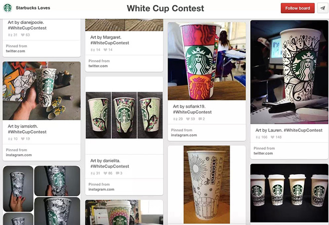 原本,只是一个为期21天的网友竞赛(2014/4/22~2014/5/12),而且已经结束近一年的活动,Starbucks就是有本事在善用了不同社群媒体的特性,让各平台各尽其责的扮演适当的角色,不只在pinterest有专门的board,脸书上也保留着white cup contest的相簿…等作为之后,让『网友在纸杯上涂鸦』变成不是一个单一的营销活动,而慢慢地变成了一种“文化”。